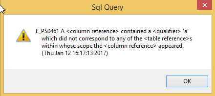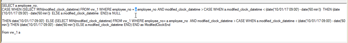 I am wanting to use a CASE statement within a SELECT statement, and the case statement has a SUB-SELECT that attempts to use a field selected from the main SELECT. When I try to run it returns an error indicating the table prefix for the table in the main SELECT is invalid. Hopefully the following screen shots will help explain.